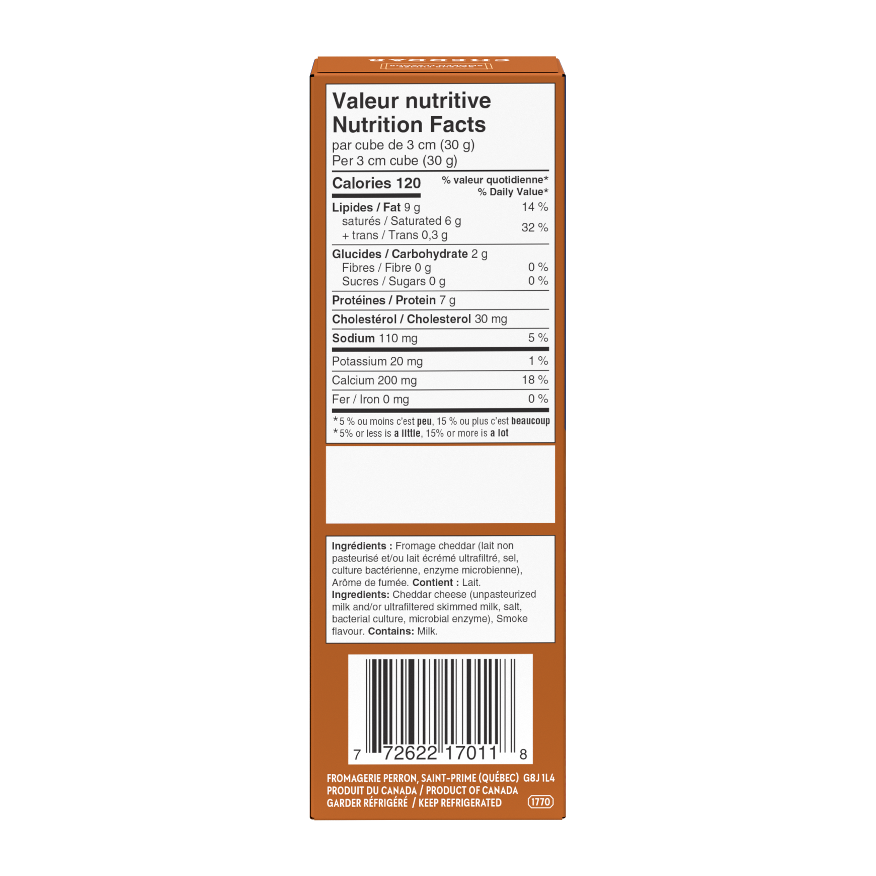 Fromage cheddar (lait non pasteurisé et/ou lait écrémé ultrafiltré, sel, culture bactérienne, enzyme microbienne), Arôme de fumée.
