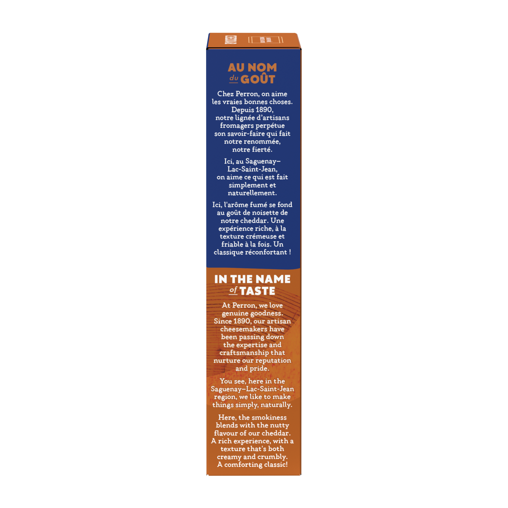 Notre fromage cheddar à saveur fumée propose un goût de noisettes accompagné de notes de fumée en bouche; un équilibre parfait des saveurs. Une expérience riche à la texture crémeuse et friable à la fois.